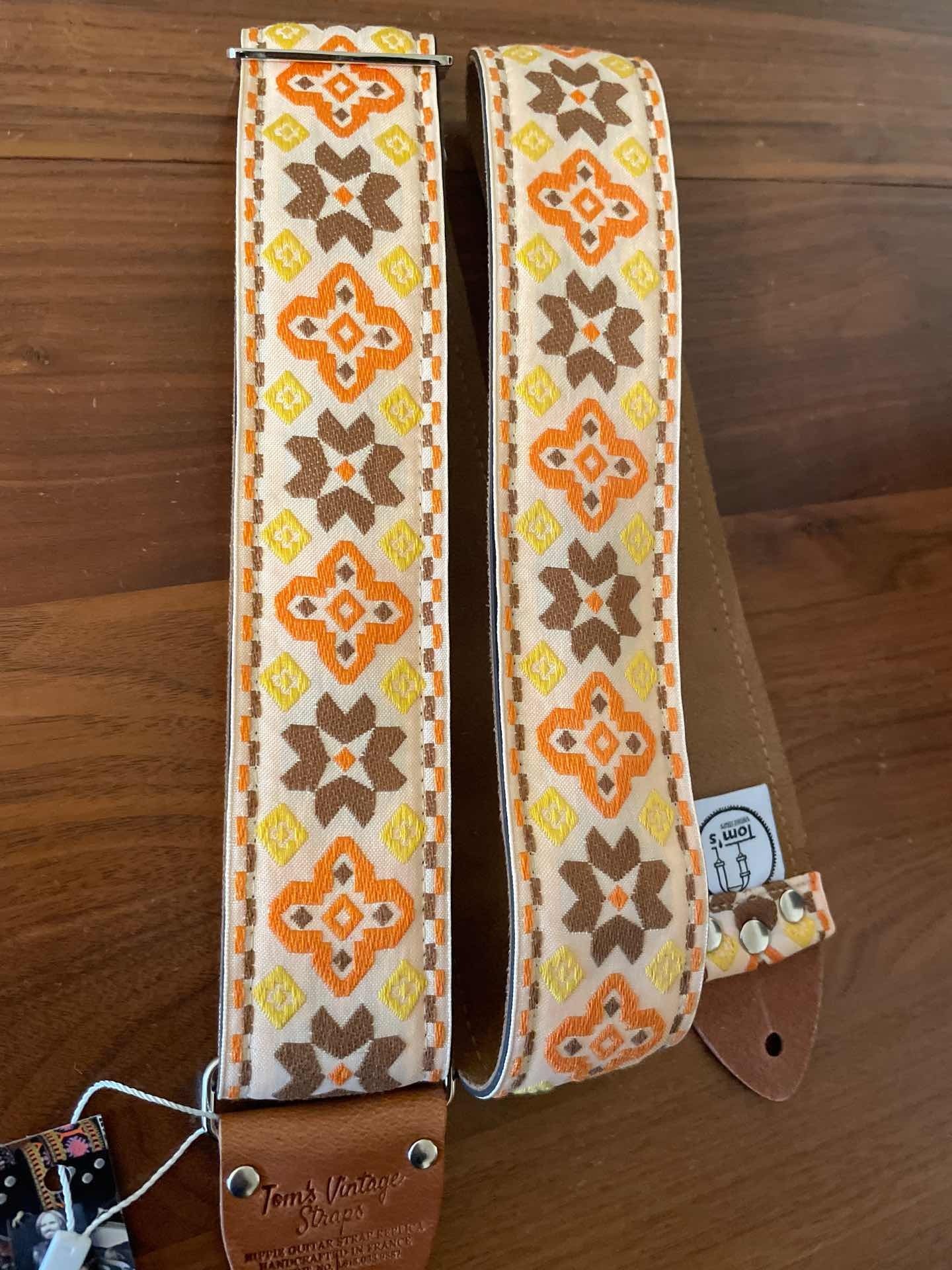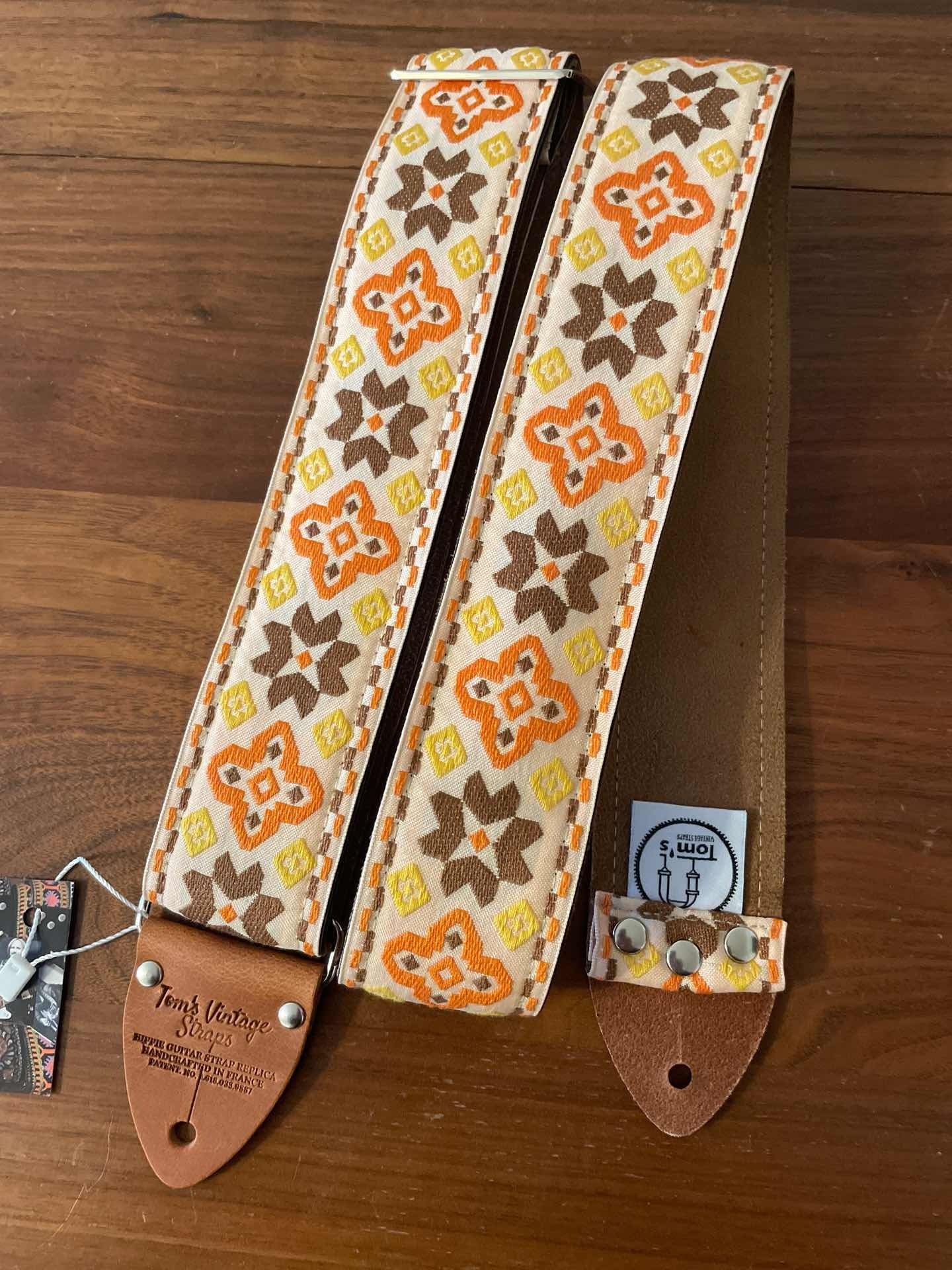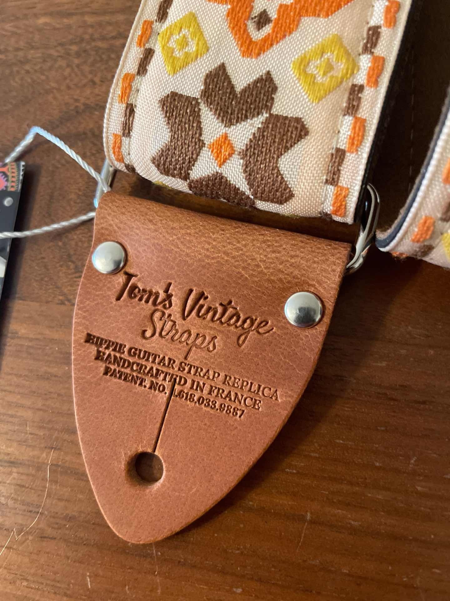 Tom’s Vintage Strapsはフランス、ストラスブールの小さな工房で一つ一つ丁寧に手作りされたギターストラップです。60年代から70年代にかけて数え切れないほどの象徴的なギタリスト(例えばエリック・クラプトン、ジミー・ペイジ、ジミ・ヘンドリックス、トム・ペティ、ジョン・メイヤー、キース・リチャーズ、カート・コバーン、ロビー・クリーガー、ロリー・ギャラガー、ボブ・ディラン、ジョー・ウォルシュ、ジョニ・ミッチェルなど)の使用によって有名になったヒッピー織りストラップの、最も本物に近い現代版レプリカです。主に60年代から70年代の New Old Stock (NOS) ファブリックを使用しており、ストラップエンドのレザーはカット、パンチング、仕上げの全てを手作業で行っています。