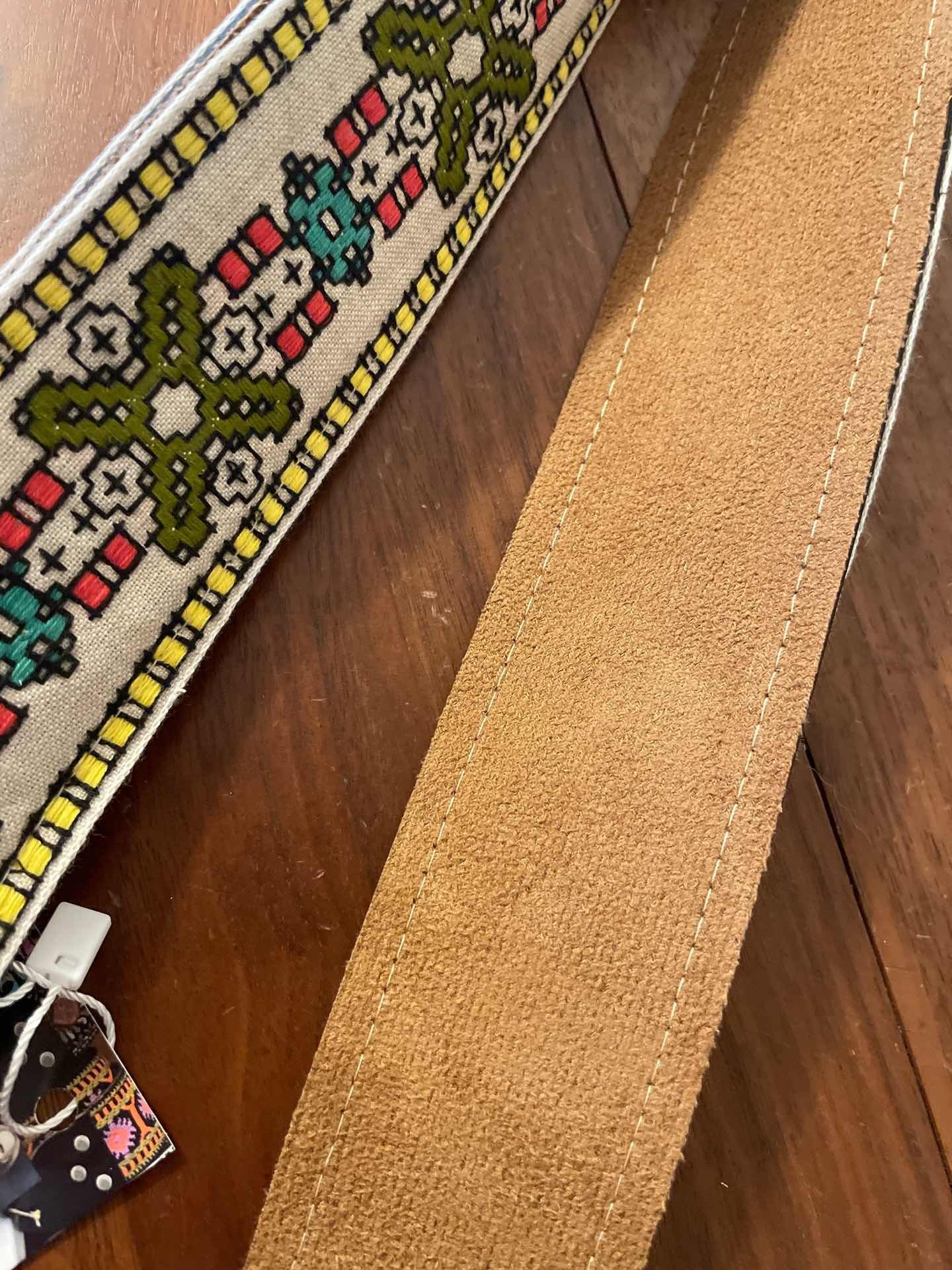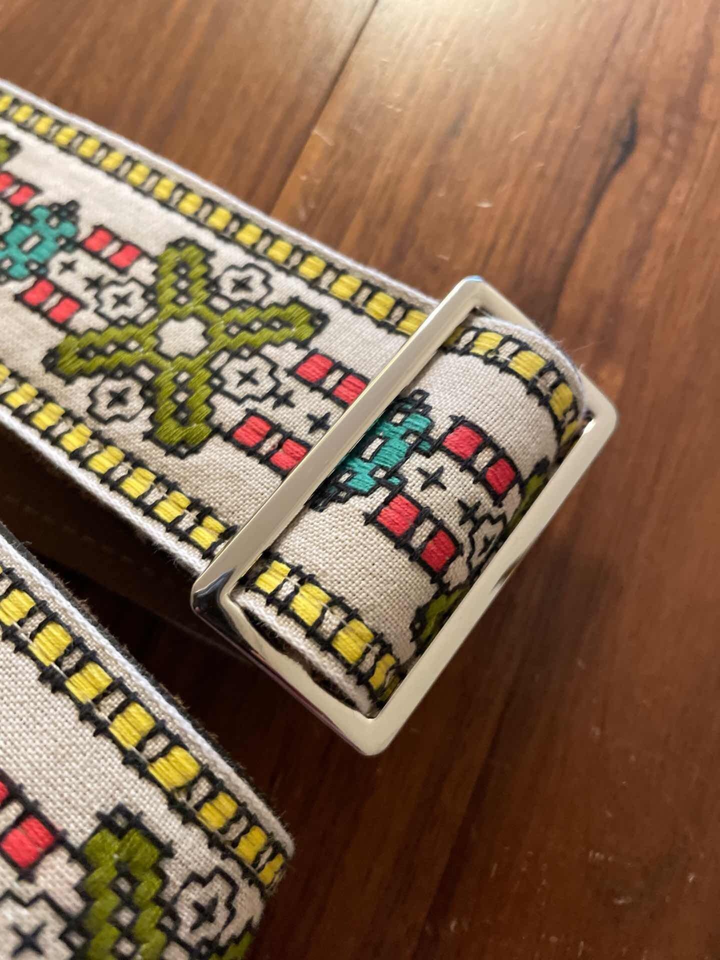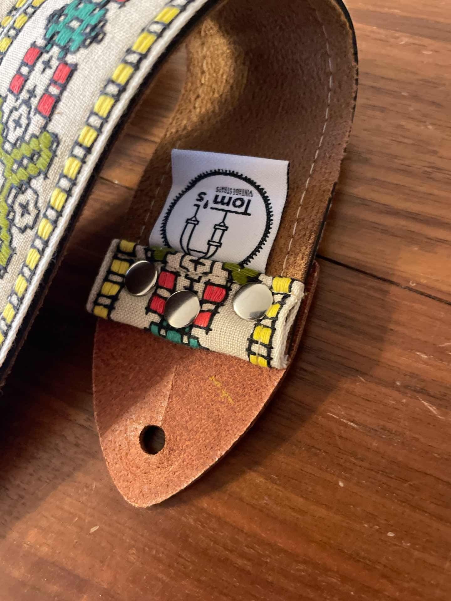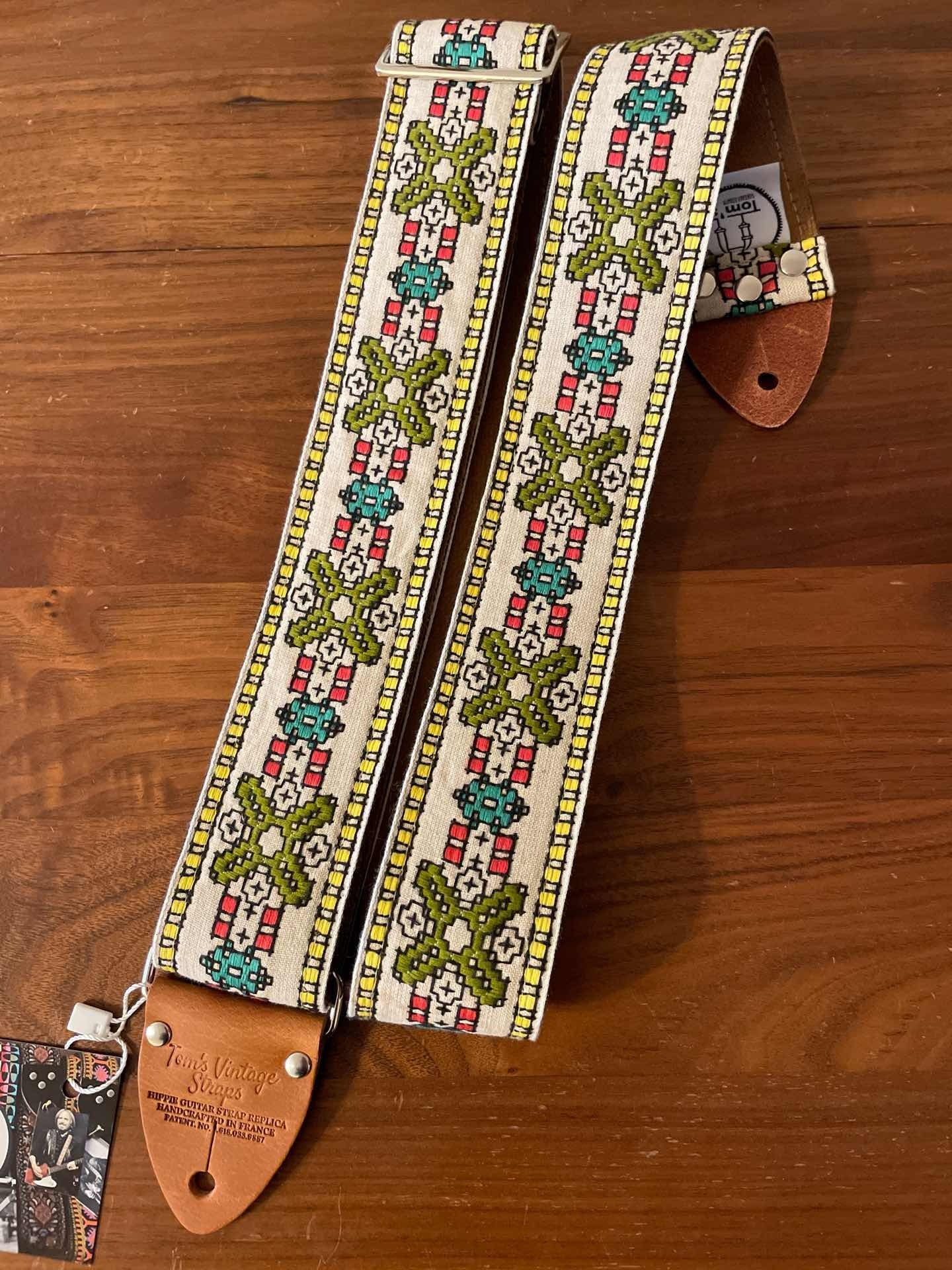 Tom’s Vintage Strapsはフランス、ストラスブールの小さな工房で一つ一つ丁寧に手作りされたギターストラップです。60年代から70年代にかけて数え切れないほどの象徴的なギタリスト(例えばエリック・クラプトン、ジミー・ペイジ、ジミ・ヘンドリックス、トム・ペティ、ジョン・メイヤー、キース・リチャーズ、カート・コバーン、ロビー・クリーガー、ロリー・ギャラガー、ボブ・ディラン、ジョー・ウォルシュ、ジョニ・ミッチェルなど)の使用によって有名になったヒッピー織りストラップの、最も本物に近い現代版レプリカです。主に60年代から70年代の New Old Stock (NOS) ファブリックを使用しており、ストラップエンドのレザーはカット、パンチング、仕上げの全てを手作業で行っています。
