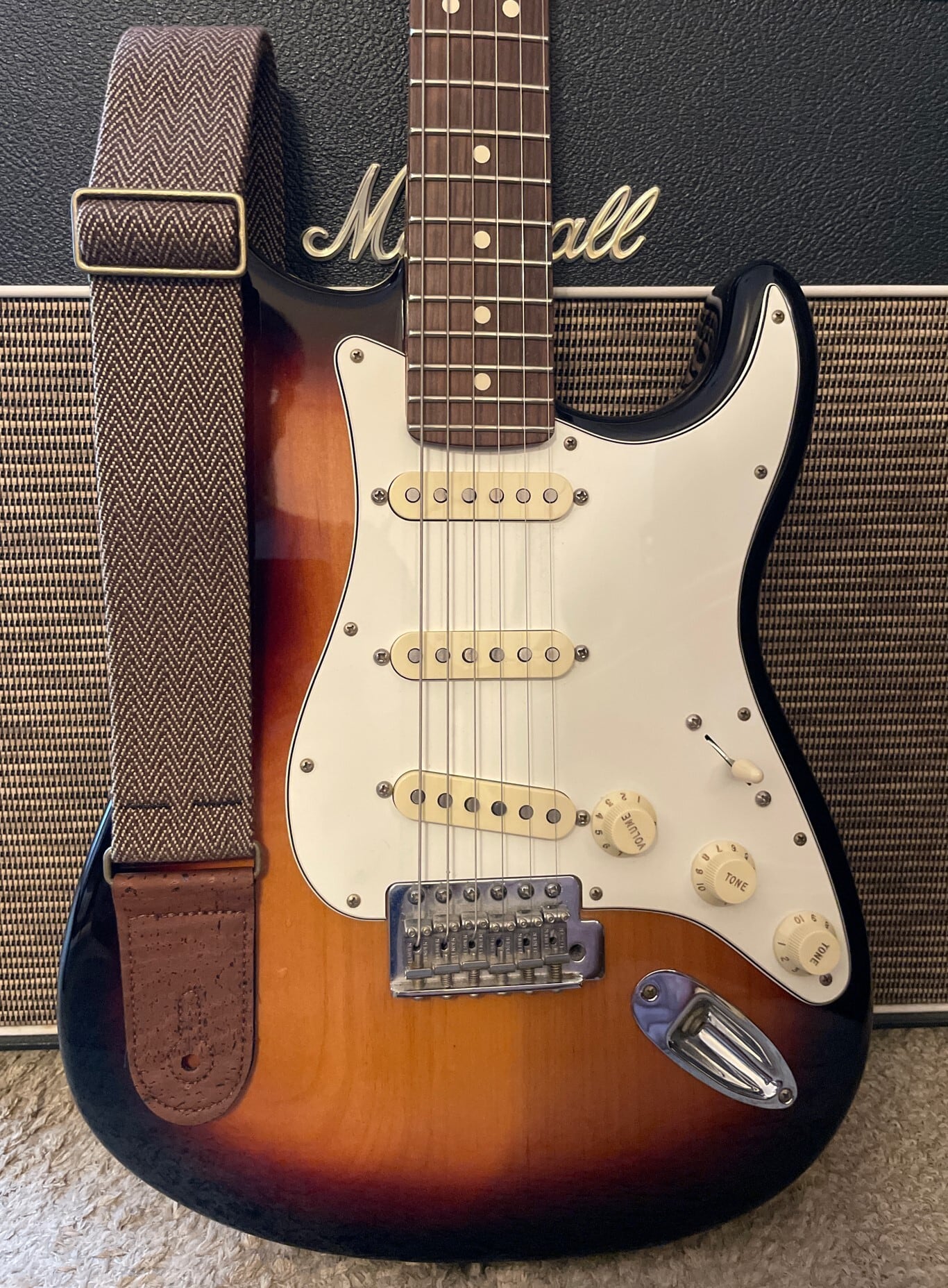 レトロなコットンツイードのギターストラップで、ストラップエンドはヴィーガン対応(製造時に動物性製品は使用されていません)のコルク生地を使用しています。高品質で耐久性があり、アコースティックギター、エレクトリックギター、ベースギターに最適です。