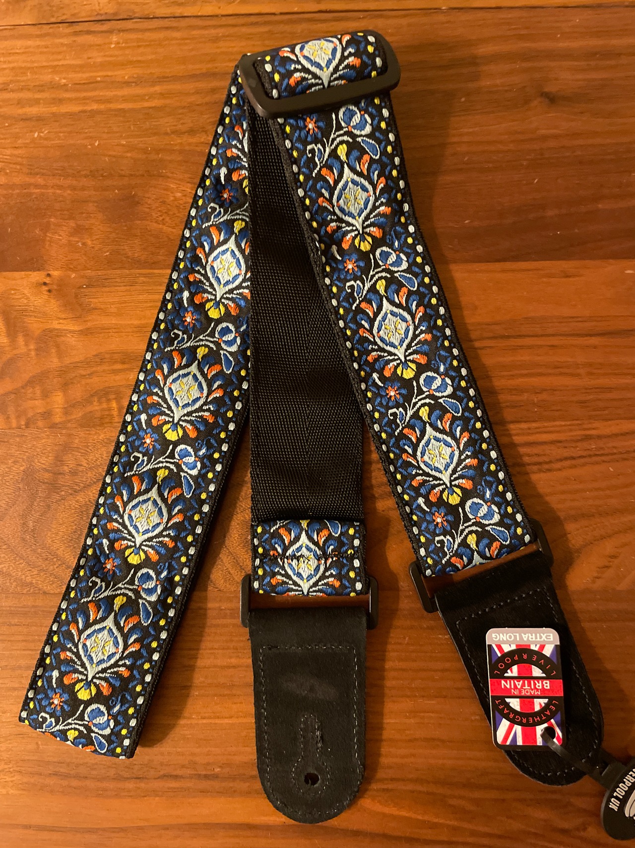 RiversideTradingGB Jacquard Strap Blue & Yellow ギターストラップ 本革エンド ハンドメイド 英国製