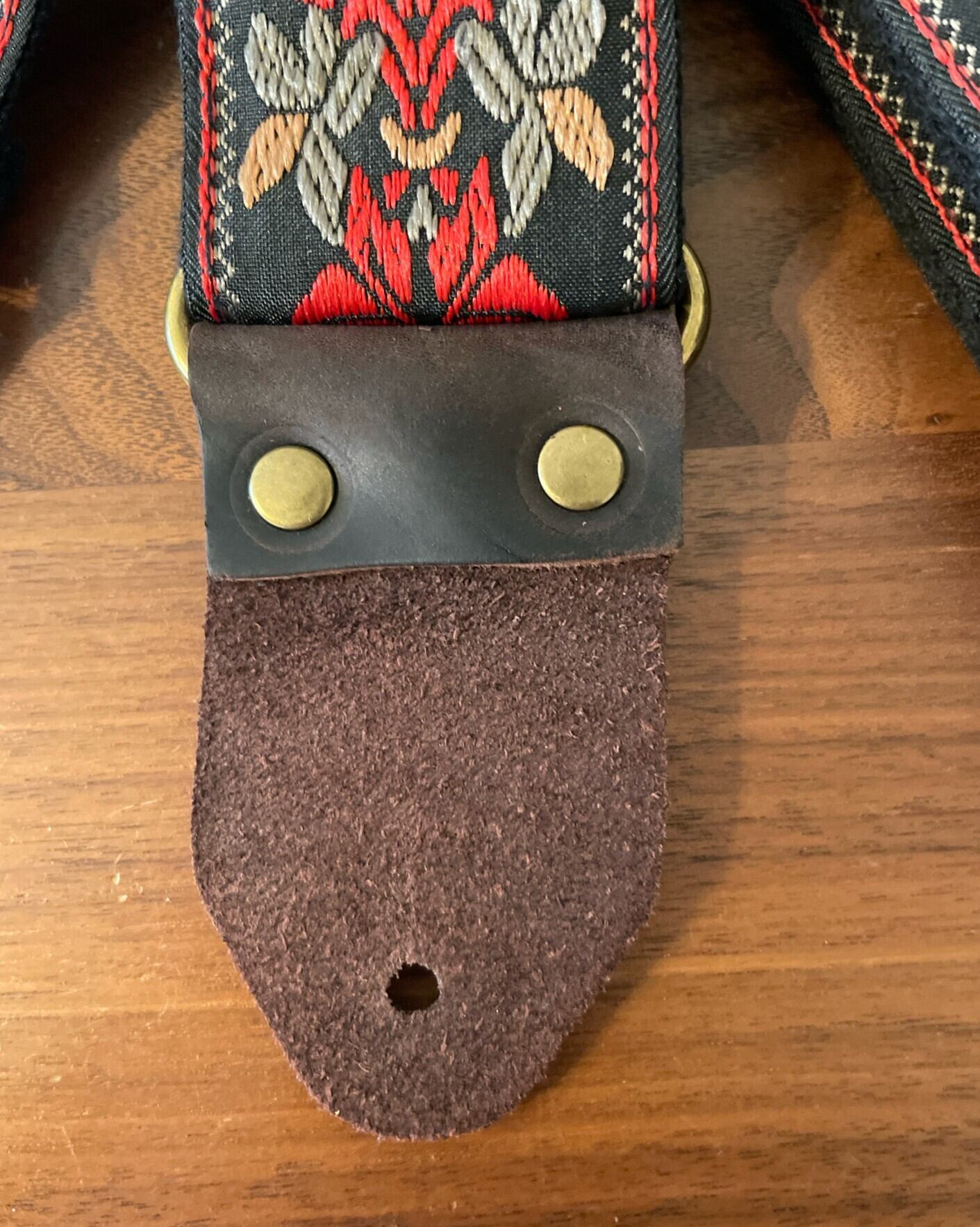 ギターストラップはナイロンベースにコットンを織り込んで作られています。ストラップエンドはダークブラウンのレザーで作られており、非常に丈夫で耐久性があります。金属製のバックルにより、あらゆる好みに合わせてストラップをスムーズに調整できます。アコースティックギターに取り付けるためのとシューレースが付属しています。