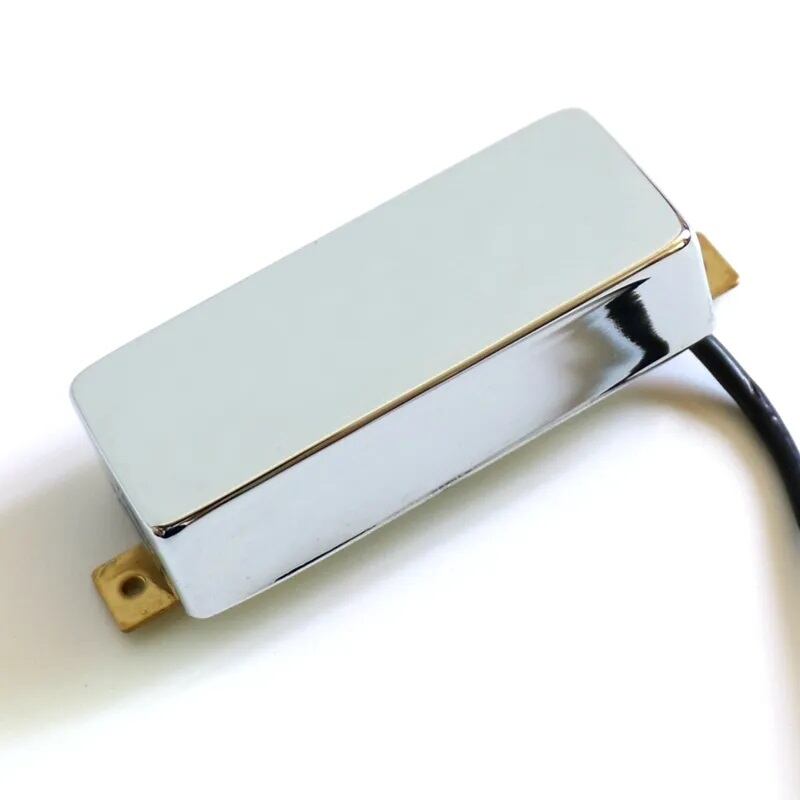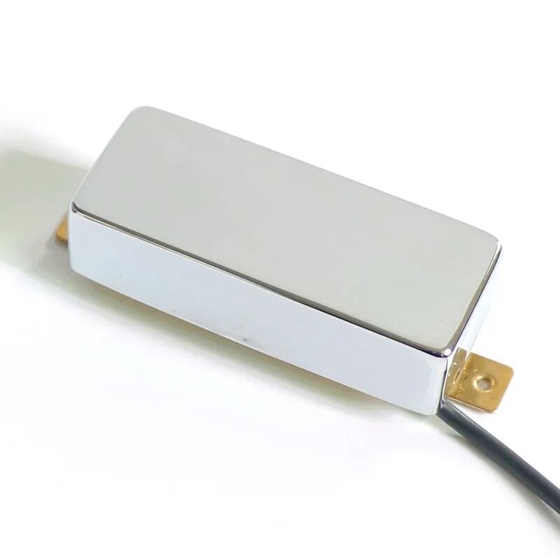 マグネットにアルニコⅤを使用したクロームカラーのカバードタイプで、セットではなくネック用単体です。サウンドはヴィンテージ系で暖かみがありつつ、ノイズレスで明るいトーンです。ポールピースタイプのミニハムバッカーと比較すると、firebirdタイプはバーマグネットを使用しているため磁界が狭く、若干エッジが効いたサウンドになります。直流抵抗値は約6.5kで弦間隔は50㎜。ベースプレートはブラス製でワイヤー長は約280㎜です。出力ワイヤーは4芯で、黒がアース、ホットが緑、シリーズ/パラレルが赤/白となっています。取り付け用のビスとスプリングが付属します。