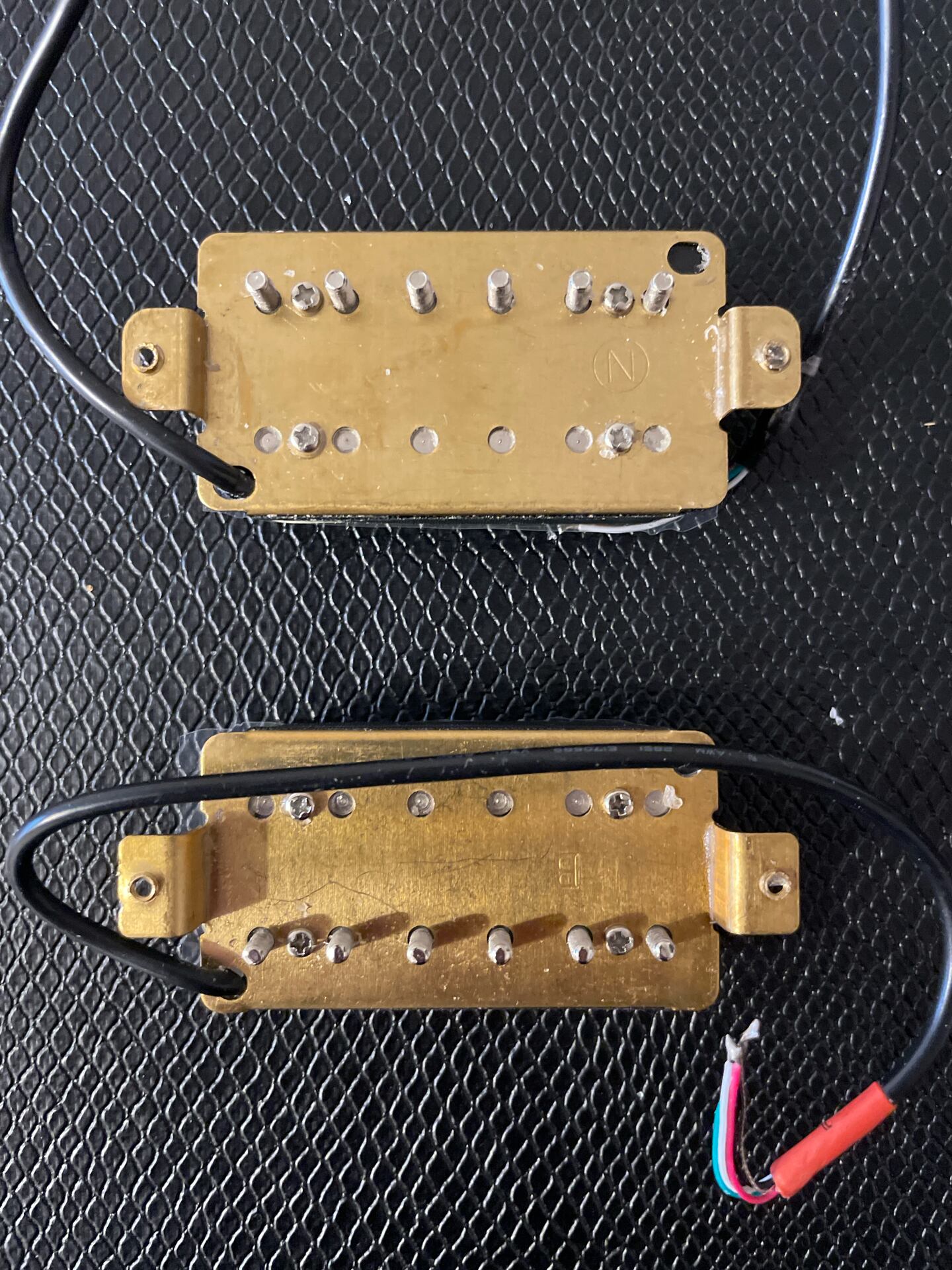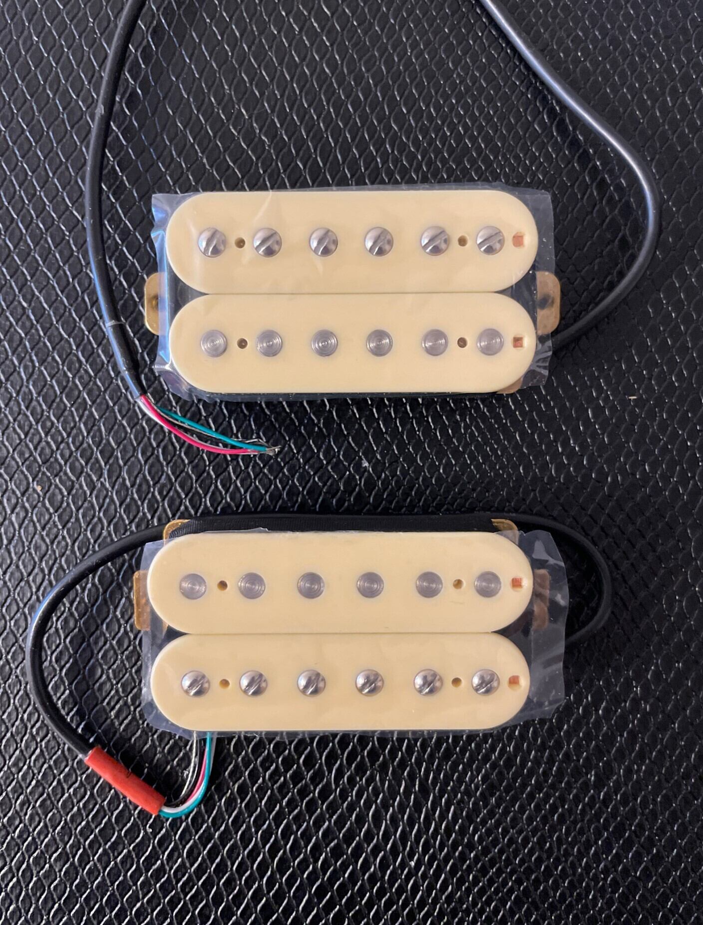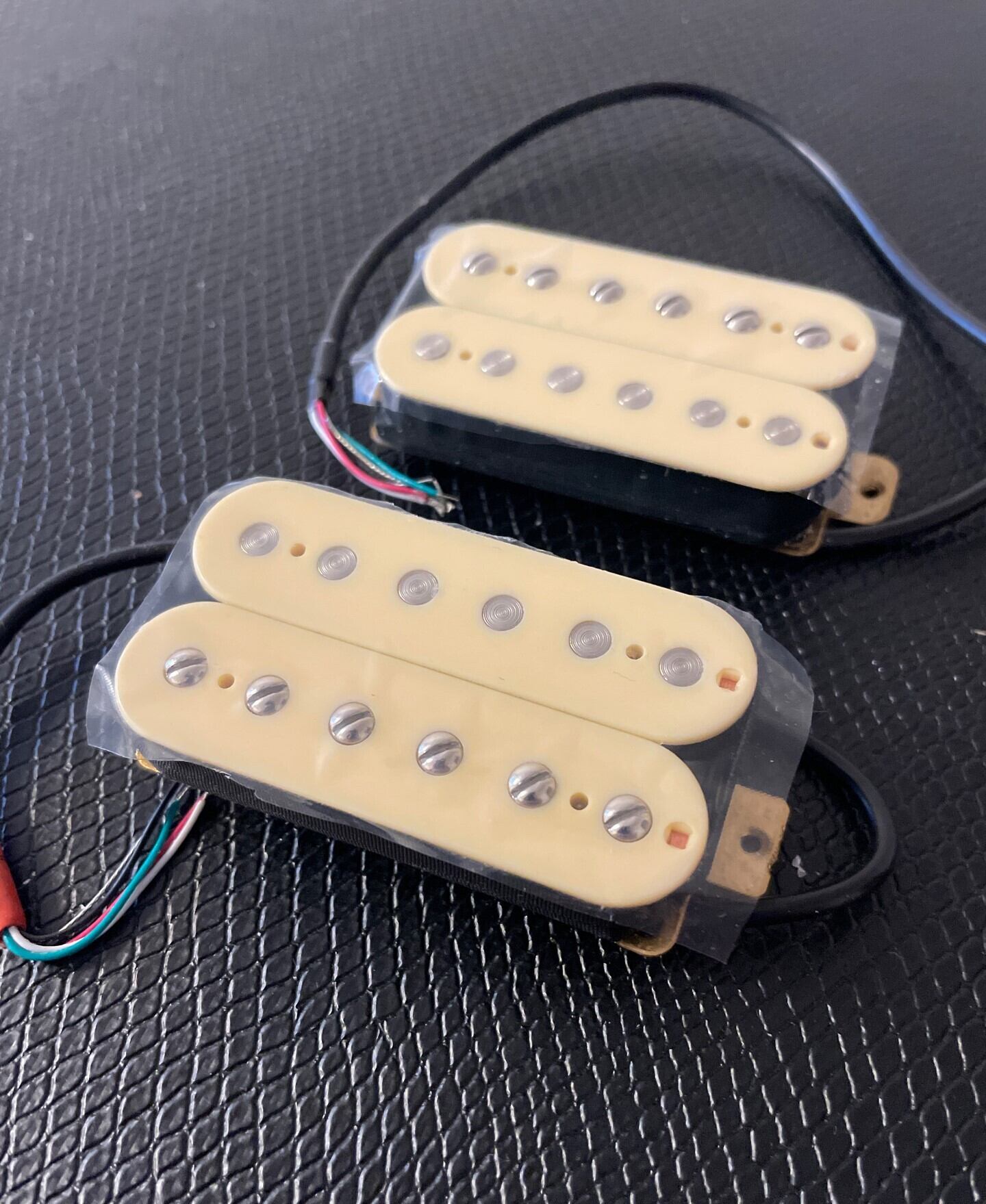 ヴィンテージPAF系のクリームハムバッカーセットで、マグネットはアルニコ5で作られています。ネックは約7.1k、ブリッジは8.4kに巻かれています。 50年代のオリジナルPAFは今日のすべてのピックアップとは異なり、特定の巻き数に合わせて作られていなかったため、7〜8.5kの間のものはすべてPAF出力と見なすことができます。PAFは当時最も安価に購入できるアルニコを使用して無差別に製造されました。これらのピックアップは、PAFで一般的に見られるアルニコ5で作られており、その結果より明るく焦点の合ったトーンが得られます。ワイヤーは4芯となっていますので、コイルタップ配線も可能となっています。