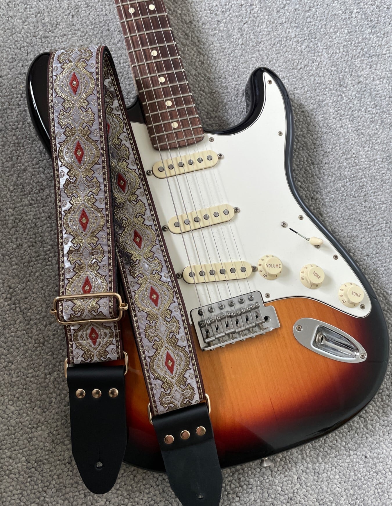 スペインで完全に手作りされ、少量ずつ製造されたヴィンテージ風ギターストラップです。生地とレザー部分は厚みがあり耐久性に優れていますが、自然にたわむドレープ性にも優れているため、長時間でも快適にプレイすることができます。裏地はブラックナイロン製ですが、比較的目が粗く、エンボス加工でロゴが入っているため滑り過ぎることは無いとい思います。