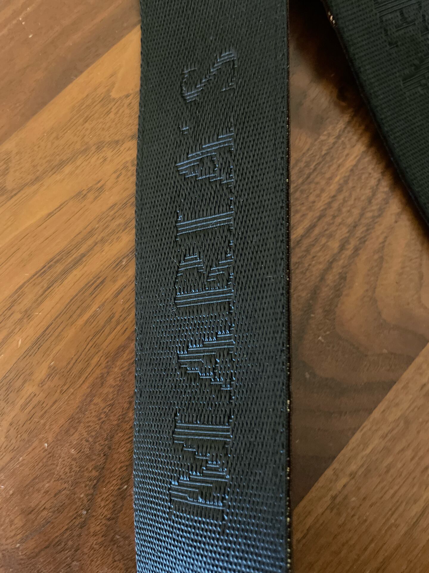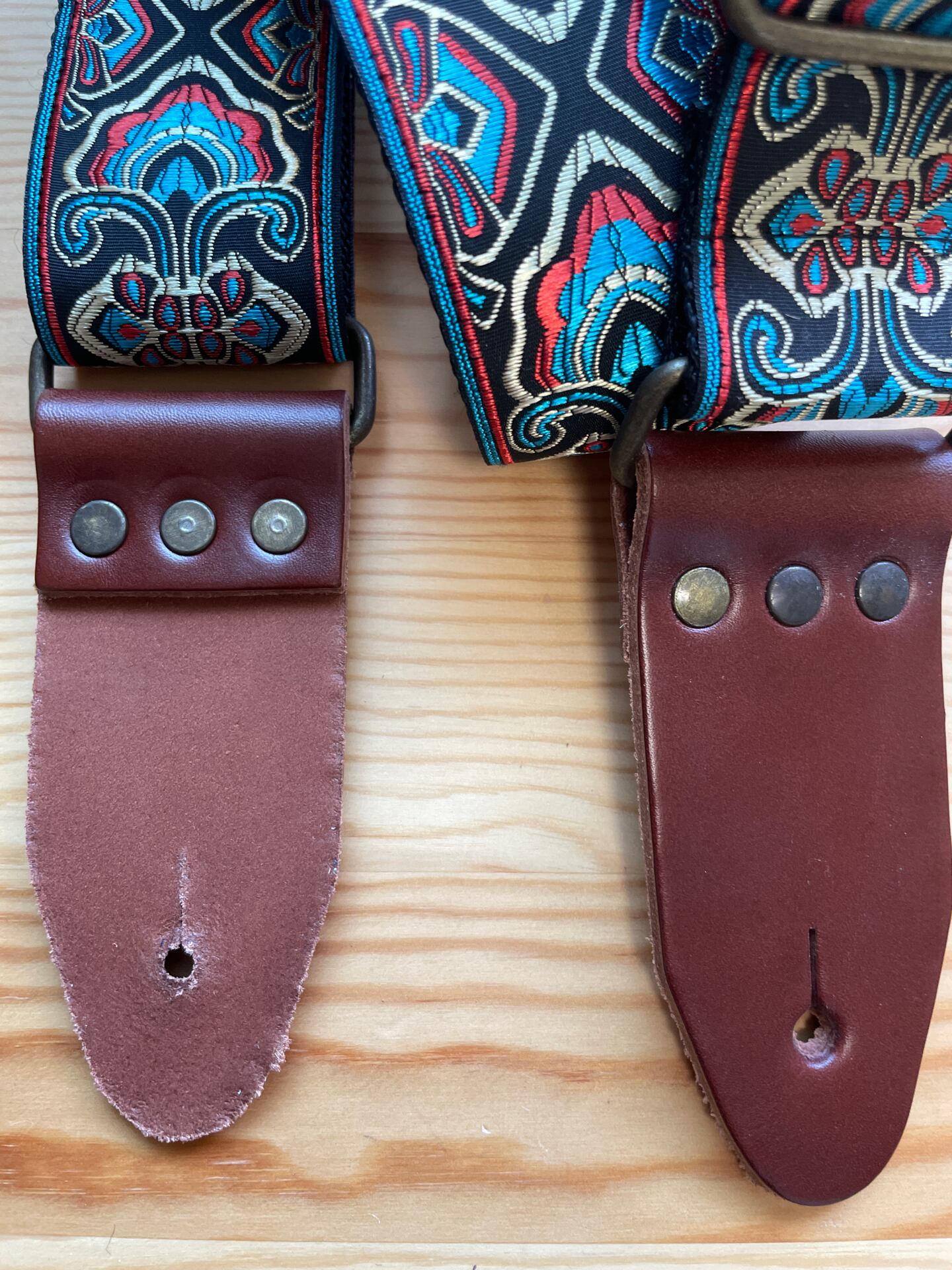 スペインで完全に手作りされ、少量ずつ製造されたヴィンテージ風ギターストラップです。生地とレザー部分は厚みがあり耐久性に優れていますが、自然にたわむドレープ性にも優れているため、長時間でも快適にプレイすることができます。裏地はブラックナイロン製ですが、比較的目が粗く、エンボス加工でロゴが入っているため滑り過ぎることは無いとい思います。