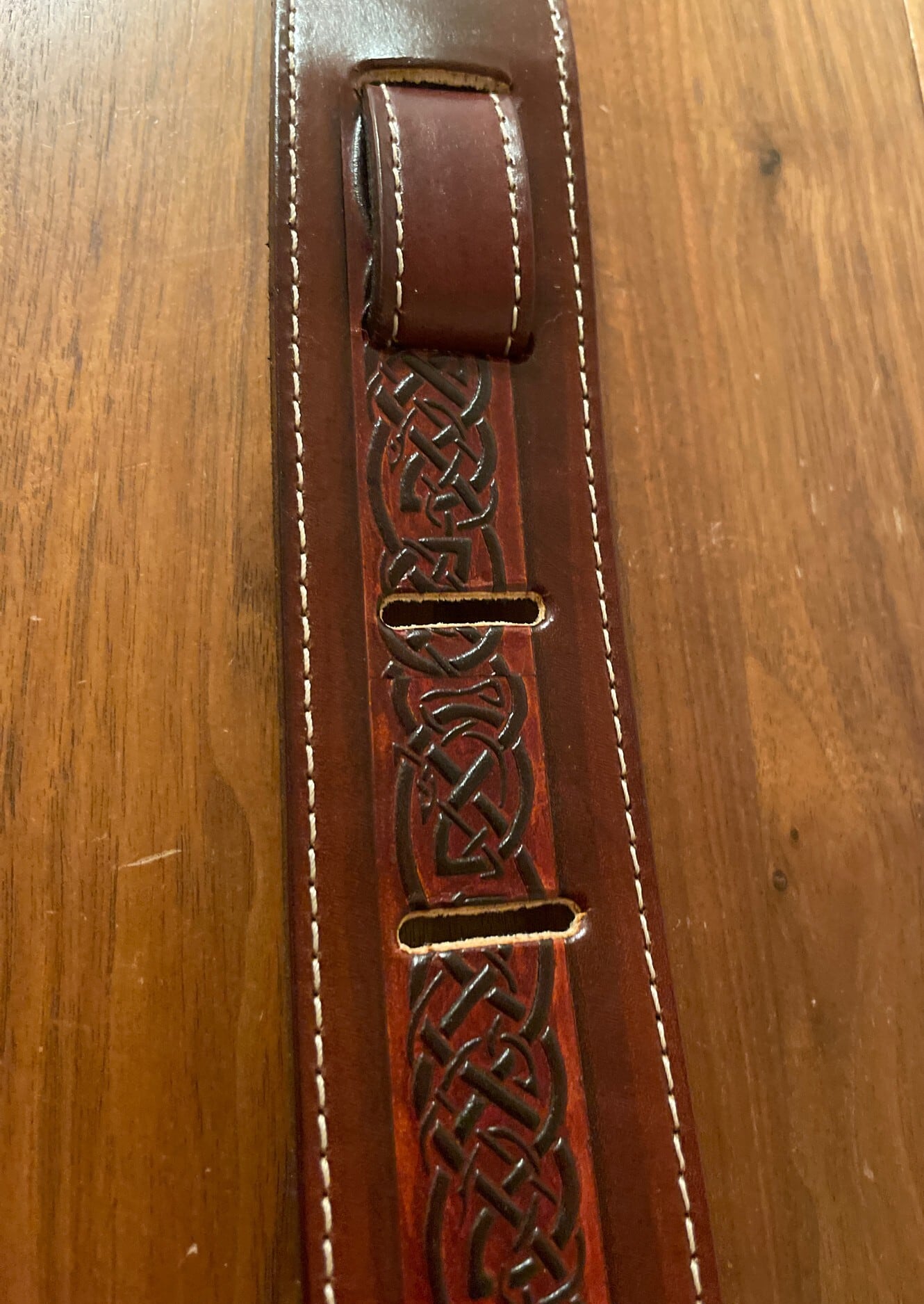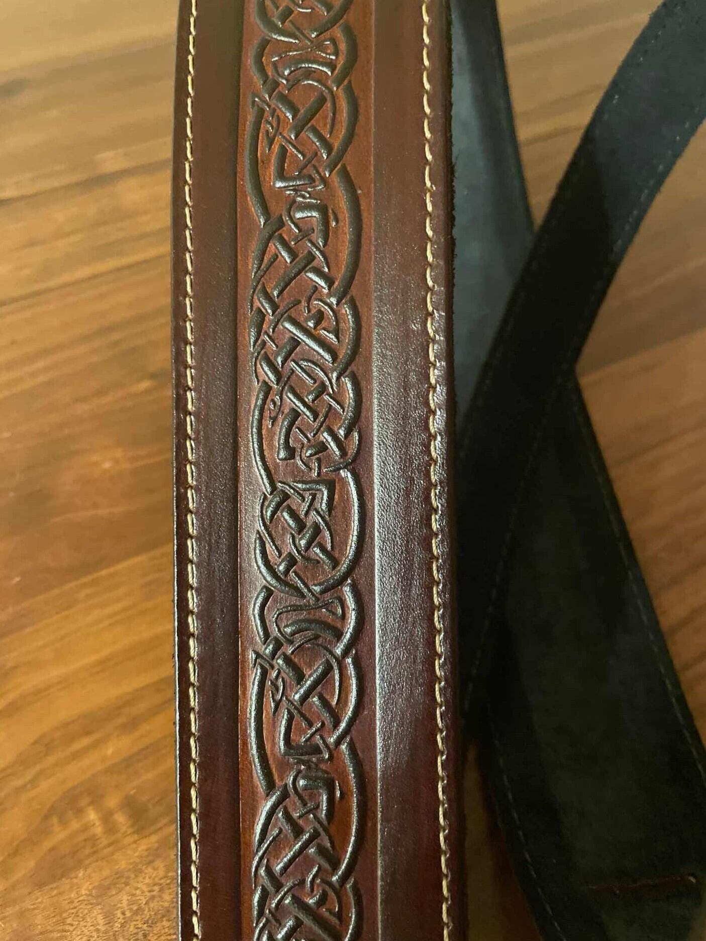 英国でハンドメイドされたこのストラップは伝統的なケルト模様がエンボス加工され、その後個別に手染めされているため、ストラップごとに微妙な違いがあります。レザーは高品質のベジタブルタンニンレザーで、使用するにつれて美しく経年変化します。裏面は柔らかいヨーロッパ産スエードで、グリップと快適さを高めています。