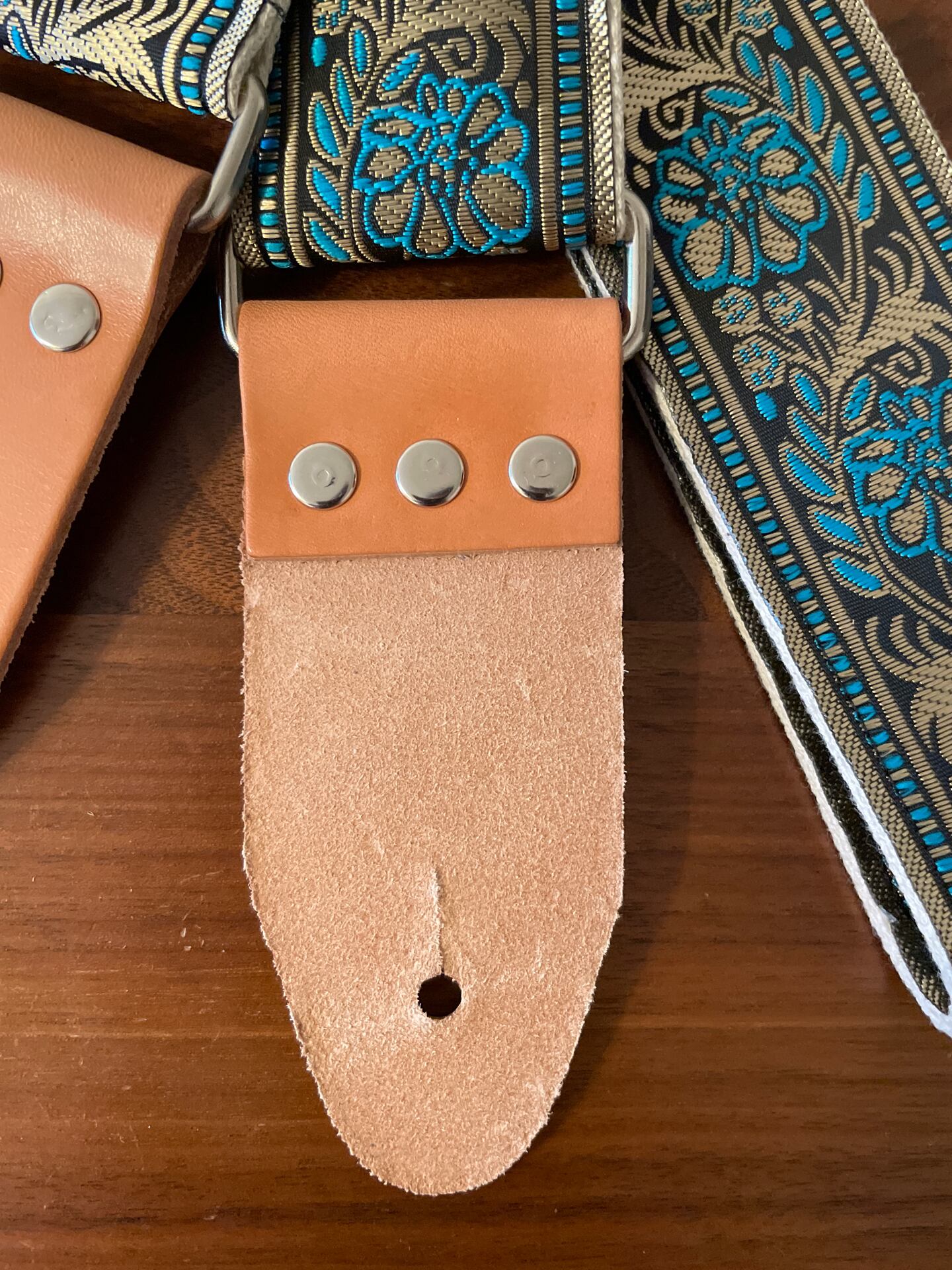 スペインで完全に手作りされ、少量ずつ製造されたヴィンテージ風ギターストラップです。生地とレザー部分は厚みがあり耐久性に優れていますが、自然にたわむドレープ性にも優れているため、長時間でも快適にプレイすることができます。裏地はアイボリーのコットン製ですので、シートベルト生地よりもホールド性が高く、且つ滑り過ぎることが無い丁度良い付け心地だと思います。