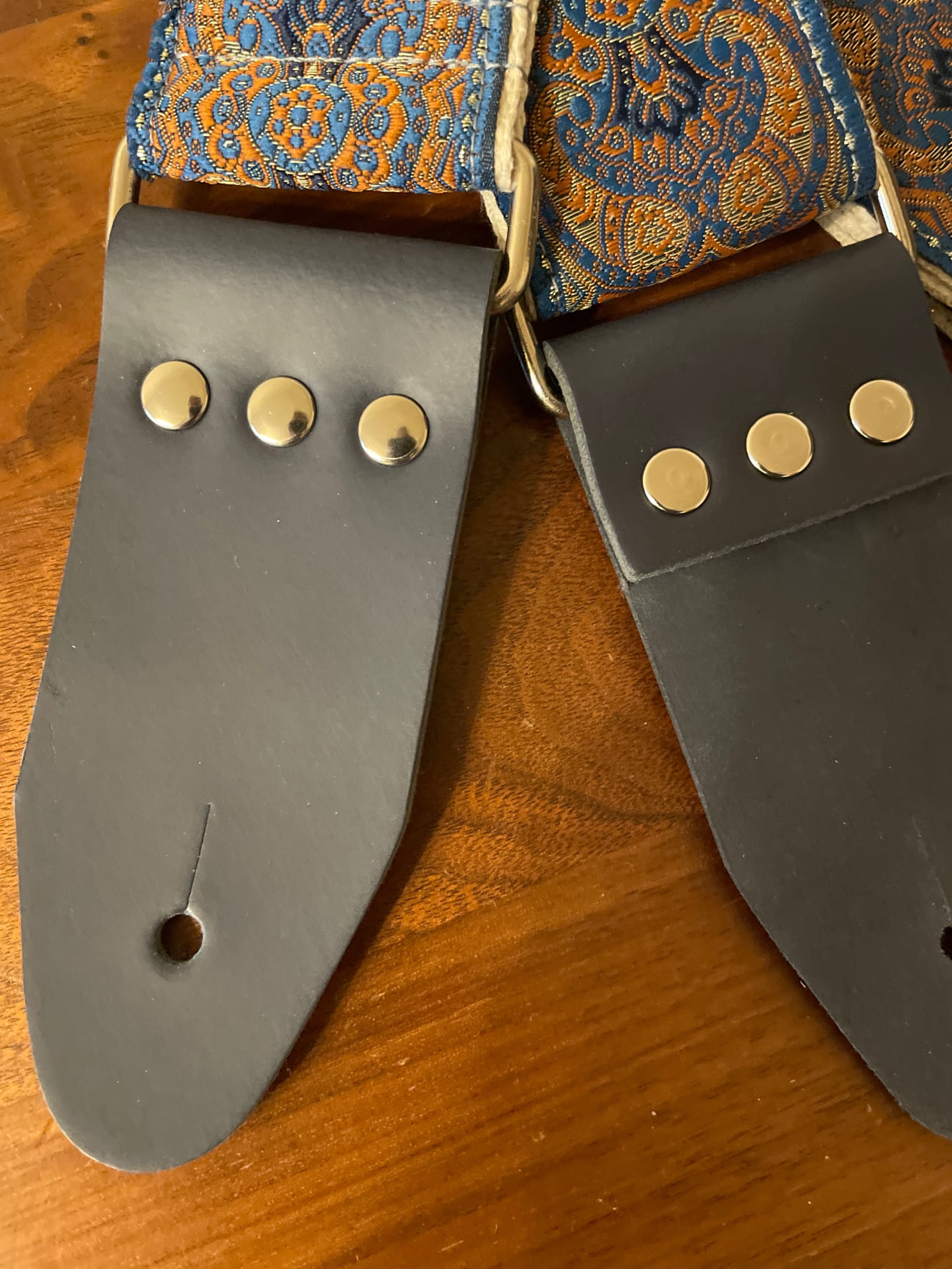 スペインで完全に手作りされ、少量ずつ製造されたヴィンテージ風ギターストラップです。生地とレザー部分は厚みがあり耐久性に優れていますが、自然にたわむドレープ性にも優れているため、長時間でも快適にプレイすることができます。裏地はアイボリーのコットン製ですので、シートベルト生地よりもホールド性が高く、且つ滑り過ぎることが無い丁度良い付け心地だと思います。